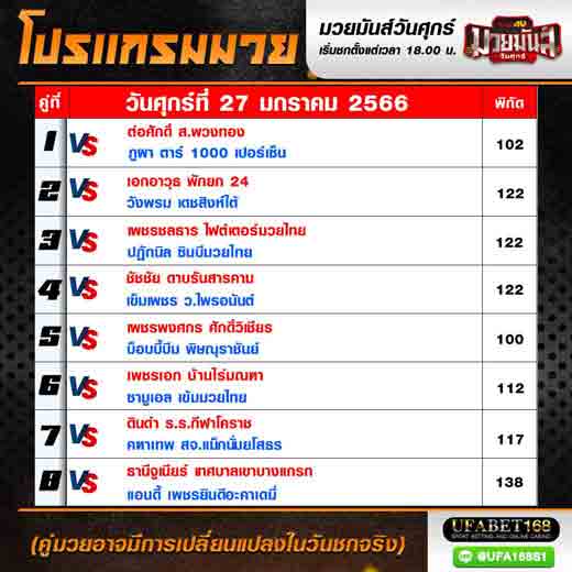 โปรแกรมการแข่งขัน มวยไทย ศึกมวยมันส์วันศุกร์
