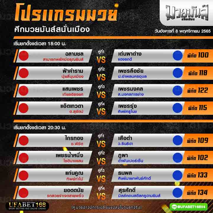 โปรแกรมการแข่งขัน มวยไทย ศึกมวยมันส์สนั่นเมือง
